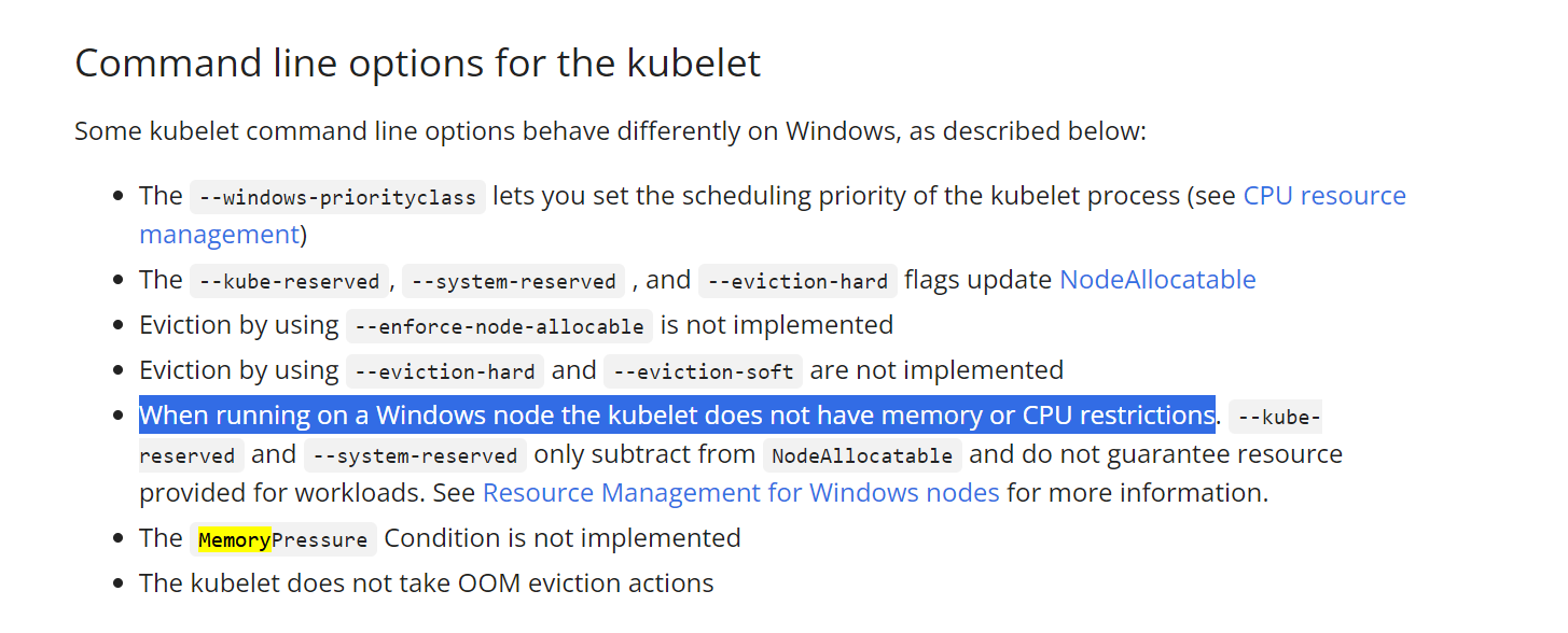 I think you’re looking at different things. One thing is to limit the CPU and Memory allocation of a container/pod. What you highlighted is the kubelet process on the Windows host, which runs with no restrictions.